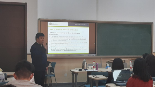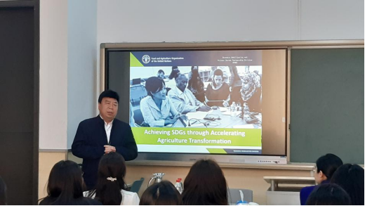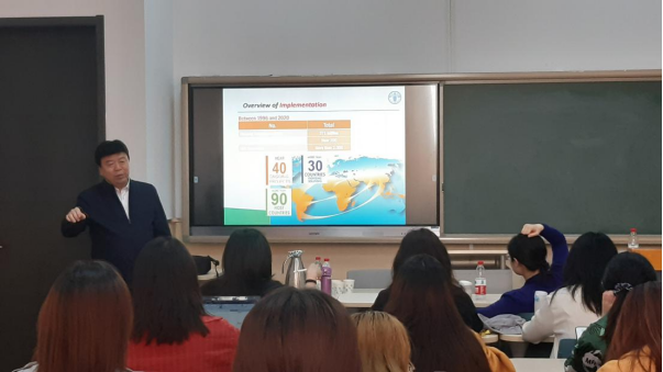 其次,刘中蔚老师通过举例详细介绍了FAO未来10年的发展战略和运作方式。FAO未来十年致力于保障世界所有国家在全球气候和环境变化的背景下能够更好、可持续地生产农产品(Better Production);消除饥饿,保障世界食品安全和人们的营养健康(Better Nutrition);通过更高效、包容、可持续的农业食品系统促进陆地和海洋生态系统的可持续利用并应对气候环境变化(Better Environment);最后通过减少不平等促进包容性经济发展,使人们过上更好的生活(Better Life)。此外,FAO的运作筹资有五种方式,分别是雨伞计划(Umbrella Programme)、多方捐助项目(Multi-donor project(MUL))、政府合作计划(Government Cooperative Programme (GCP))、单边信托基金(Unilateral Trust Fund (UTF))和联合国联合方案(United Nations Joint Programme (UNJP))。刘中蔚老师对这五种方式分别做了详细的说明,结合具体案例加深了师生们对FAO运作方式的理解,并对国际组织如何合理分配资源、加深合作等相关问题进行了拓展。