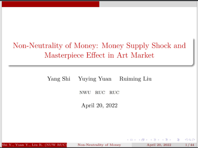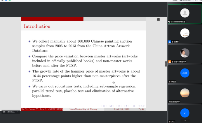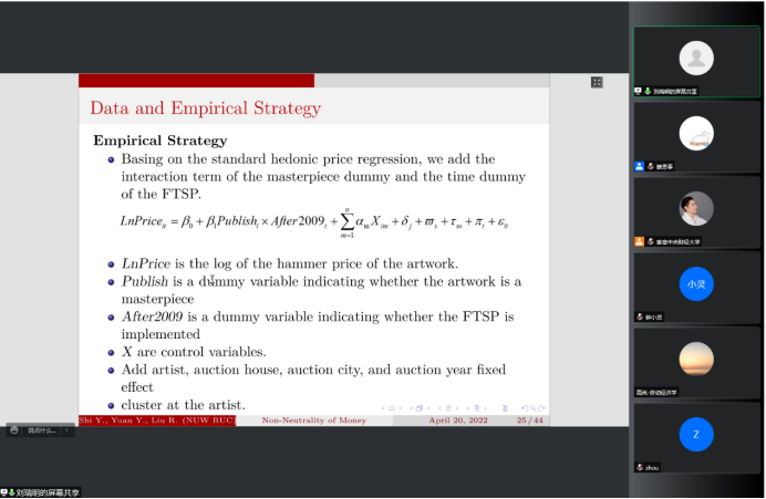 2022年5月12日14:00,中国人民大学国家发展与战略研究院教授、博士生导师刘瑞明应德赢官网Vwin邀请,开展主题为“Non-Neutrality of Money:Money Supply Shock and Masterpiece Effect in Art Market”的讲座,本次讲座通过腾讯会议平台线上举行,刘瑞明老师受到了老师和同学们的热烈欢迎!德赢官网Vwin黄乃静副教授主持了线上学术交流会,陈斌开院长、尹振东教授与2020级博士生共同参与了本次学术交流。