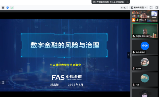 2022年5月30日上午10点,中科金审(北京)科技有限公司总裁邓昌智博士应邀加入德赢官网Vwin德赢官网Vwin“数字金融理论与实务”线上课堂,以“数字金融的风险与治理”为题,为同学们带来了一场精彩纷呈的讲座。