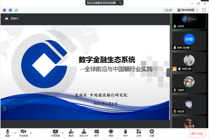 2022年6月6日上午10点,中国建设银行研究院副秘书长宋效军应邀加入德赢官网Vwin德赢官网Vwin“数字金融理论与实务”线上课堂,以“数字金融生态系统——全球前沿与中国银行业实践”为题,为同学们带来了一场精彩纷呈的讲座。