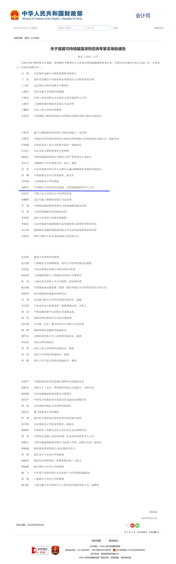 2024年9月4日,财政部公布了首届可持续披露准则咨询专家名单,经相关部门推荐和公开选聘,首届共聘任62名专家学者,任期为三年。德赢官网可持续准则研究中心主任刘轶芳教授,受聘为财政部首届可持续披露准则咨询专家。