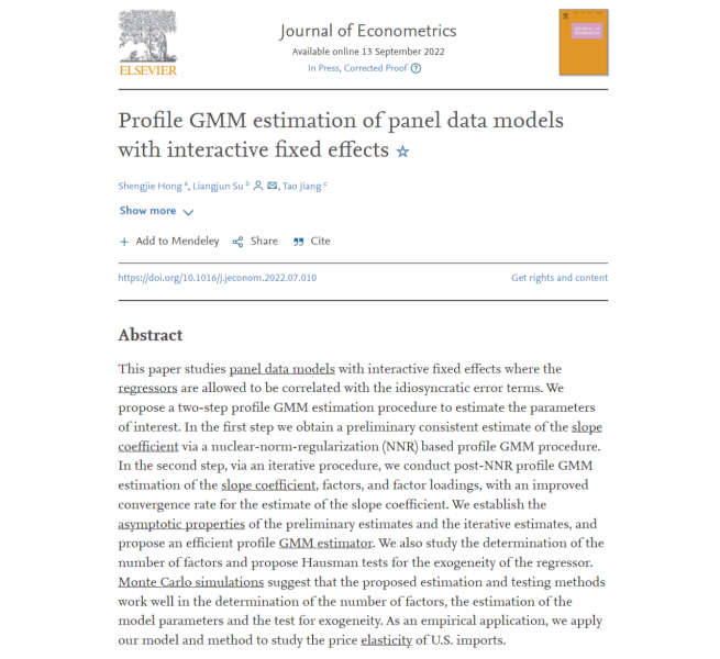 论文简介:本文把机器学习的新兴方法核范数正则化(nuclear norm regularization)与经典广义矩法 (GMM)深度融合,提出了对于存在内生性解释变量和交互固定效应的面板模型的估计方法。该研究的主要贡献在于:一、在交互固定效应存在的同时允许解释变量具有内生性(在此之前的关于交互固定效应模型的理论方法都要求解释变量是外生的),大幅拓展了交互固定效应面板数据模型在实证研究中的应用范围;二、核范数正则化的机器学习方法与广义矩法估计的深度融合,使得此项研究提出的新估计方法在算法表现上更稳健和省时,并且不依赖一些常见的为保障初始估计一致性所做的技术性假设(这些假设常见于当前主流的单纯基于主成分分析的交互固定效应模板估计方法中);三、该研究为使用微观数据估计国际贸易中的一个重要参数,进口需求的价格弹性,提供了重要的计量框架。