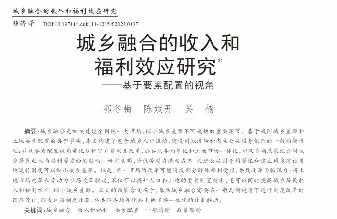 学术视点 | 德赢官网郭冬梅、陈斌开、吴楠老师的合作论文《城乡融合的收入和福利效应研究——基于要素配置的视角》在《管理世界》刊发