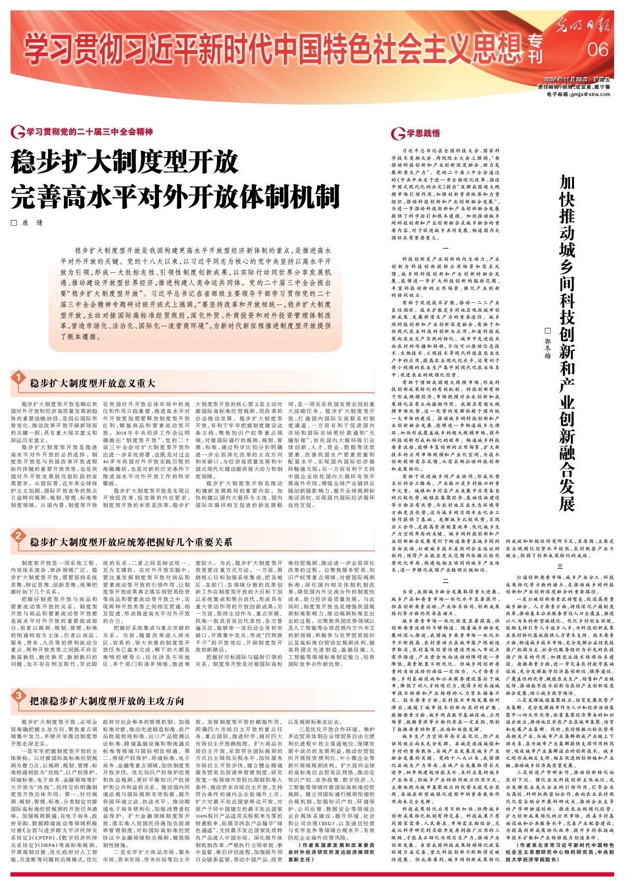 11月22日,《光明日报》学习贯彻习近平新时代中国特色社会主义思想专刊刊发我校德赢官网Vwin院长郭冬梅教授署名文章——《加快推动城乡间科技创新和产业创新融合发展》。