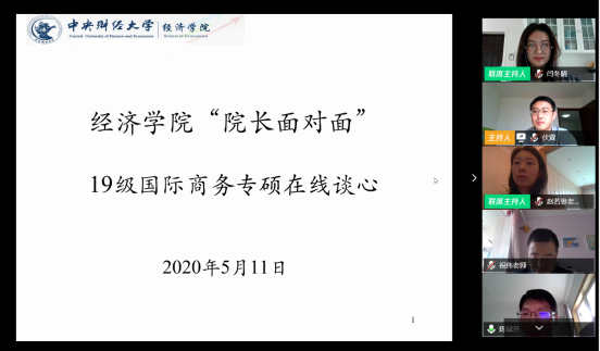 为深入了解国际商务专硕学生的想法和期待,进一步提升学院国际商务专硕的培养质量,院长陈斌开、副院长伏霖、副书记耿卉、组织员刘滨、国际经济系主任于爱芝、顾炜宇、祝伟、赵若思等8位专任教师和教辅老师于2020年5月11日下午,以在线会议的方式举行此次的“院长面对面”活动。陈斌开院长以及各位老师与德赢官网Vwin19级国际商务专硕班的全体学生,围绕专硕同学就学习和生活方面的切身问题,进行深入的交流沟通。