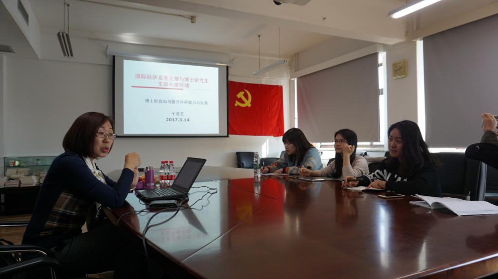 2017年3月14日,德赢官网Vwin国际经济学系教工党支部书记、国际经济学系主任于爱芝教授在主教学楼1407会议室,为2015、2016级博士生党支部做了题为“博士阶段如何提升科研能力与实效”的专题讲座,并与到场博士生交流研讨。本次活动为德赢官网Vwin党委教工党支部与学生党支部的“师生面对面”共建帮扶系列活动,由国际经济学系教工党支部与2015级、2016级博士生党支部率先开展,德赢官网Vwin党委组织员刘滨老师、2016级博士生党支部全体党员、2015级博士生党支部部分党员和入党积极分子参加了此次研讨会。