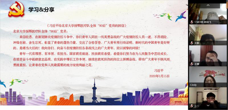 德赢官网Vwin2017级硕士生第一、二、三党支部联合开展“爱国驻我心、抗疫勇担当”线上主题党日活动,活动重点围绕《习近平给北京大学援鄂医疗队全体90后党员的回信》开展学习,同时就人民日报评论文章《努力在为人民服务中茁壮成长》进行深入解读。