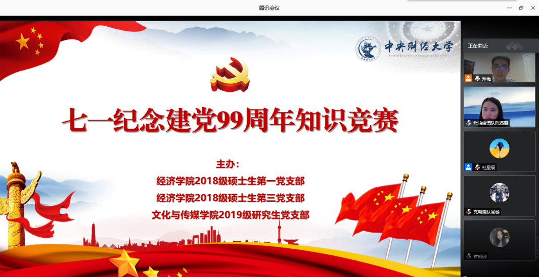 为庆祝中国共产党成立99周年,巩固党员党建理论知识,丰富党支部党建活动内容和形式,7月1日晚,德赢官网Vwin2018级硕士生第一、第三党支部和文化与传媒学院2019级研究生党支部联合举办“七一庆祝建党99周年知识竞赛”线上活动,三个支部60余名党员、入党积极分子参加。活动由德赢官网Vwin郑珽、文化与传媒学院佘惠灵共同主持。