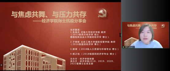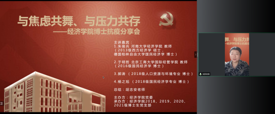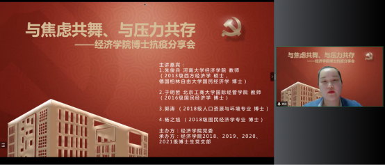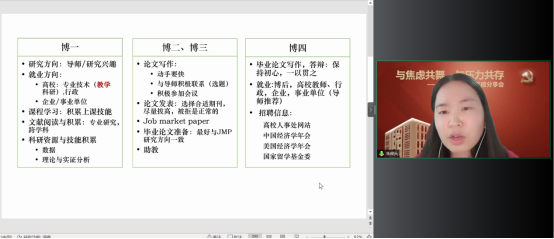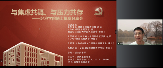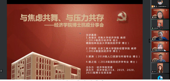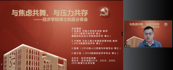 德赢官网Vwin党委在切实做好校园疫情防控工作的基础上,帮助博士生树立正确的就业择业观,缓解博士生对不同学习阶段以及未来职业生涯规划的压力,在全院博士生中深入开展了以学业规划和择业选择为主题的抗疫分享会。2022年5月14日,德赢官网Vwin特邀在高校就职的博士校友代表朱俊兵、于明哲和2018级博士党支部代表郭涛、杨之旭,充分发挥自身科研知识与专业特长,为经院博士生答疑解惑,并邀请胡志安老师作总结发言。活动由德赢官网Vwin党委组织员刘滨老师和2018级博士生党支部书记马陆共同主持,2018、2019、2020、2021级博士党支部联合承办。
