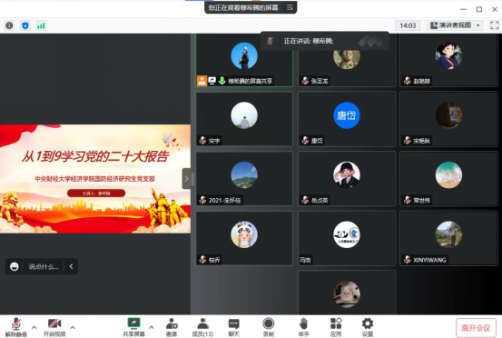 11月1日,德赢官网Vwin国防经济研究生党支部在南路校区图配楼205以线上和线下相结合的方式,召开党的二十大精神专题学习研讨会。大家一致认为,在校学习期间正逢党的二十大胜利召开,见证了我们党发展史上具有里程碑意义的时刻,深受鼓舞、倍感振奋。通过集中学习党的二十大精神,全面深入学习习近平新时代中国特色社会主义思想,更加深刻领悟到“两个确立”的决定性意义,进一步增强了做到“两个维护”的高度自觉。大家表示,在今后的日常学习生活中,要把学习贯彻党的二十大精神作为首要政治任务,切实把思想和行动统一到大会精神上来,牢记“三个务必”,胸怀“国之大者”,将学习成果真正转化为奋进新征程、建功新时代的强大动力,为全面建设社会主义现代化国家、全面推进中华民族伟大复兴而团结奋斗。