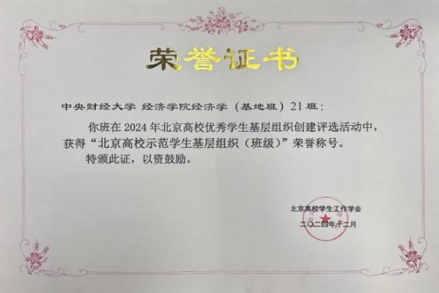 此次获评“北京高校示范学生基层组织(班级)”的经济学(基地班)21 班,是学院基层组织建设的优秀典范。在党团建设、志愿服务、学术科研以及继续深造等多方面,该班均取得令人瞩目的成绩。学业上,班级10名学生保研率达100%,共修读580余门课程,其中151门课程成绩达95分以上,342门课程成绩达90分以上,2023--2024学年班级学分加权平均分高达92.04分。综合素质培养方面,基地2021级学生累计获得国家级奖项17人次,省部级奖项10人次,校级奖项50余人次、院级奖项26人次。还荣获2023年校级“五四红旗团支部”荣誉称号。志愿服务方面,本科前三年累计完成志愿服务时长超过550小时,充分展现出新时代青年学生的责任担当。