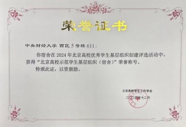 西区5号楼611宿舍荣获“北京高校示范学生基层组织(宿舍)”称号,同样彰显出学院基层建设的扎实成效,宿舍内4位经济学专业同学,在学习科研、社会实践和宿舍文化建设方面表现卓越。大二学年,4人加权平均分均超93分,其中2人累计加权平均分超94分,在经济学专业排名分别为第 1、2、5、9 名。大学两年半期间,4人累计获奖约60 项,其中国家级奖项11项,2 人次获得国家奖学金,2024年该宿舍还被评为德赢官网Vwin优秀宿舍。