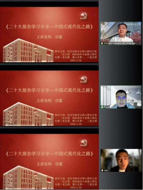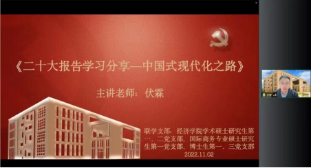2022年11月2日,德赢官网Vwin德赢官网Vwin党委委员、副院长伏霖为德赢官网Vwin学术硕士研究生第一、二党支部,国际商务专业硕士研究生第一党支部,博士生第一、三党支部作主题为“二十大报告学习分享——中国式现代化之路”的专题讲座。博士研究生第三党支部书记冯博主持活动,80余位师生党员及入党积极分子线上参加。