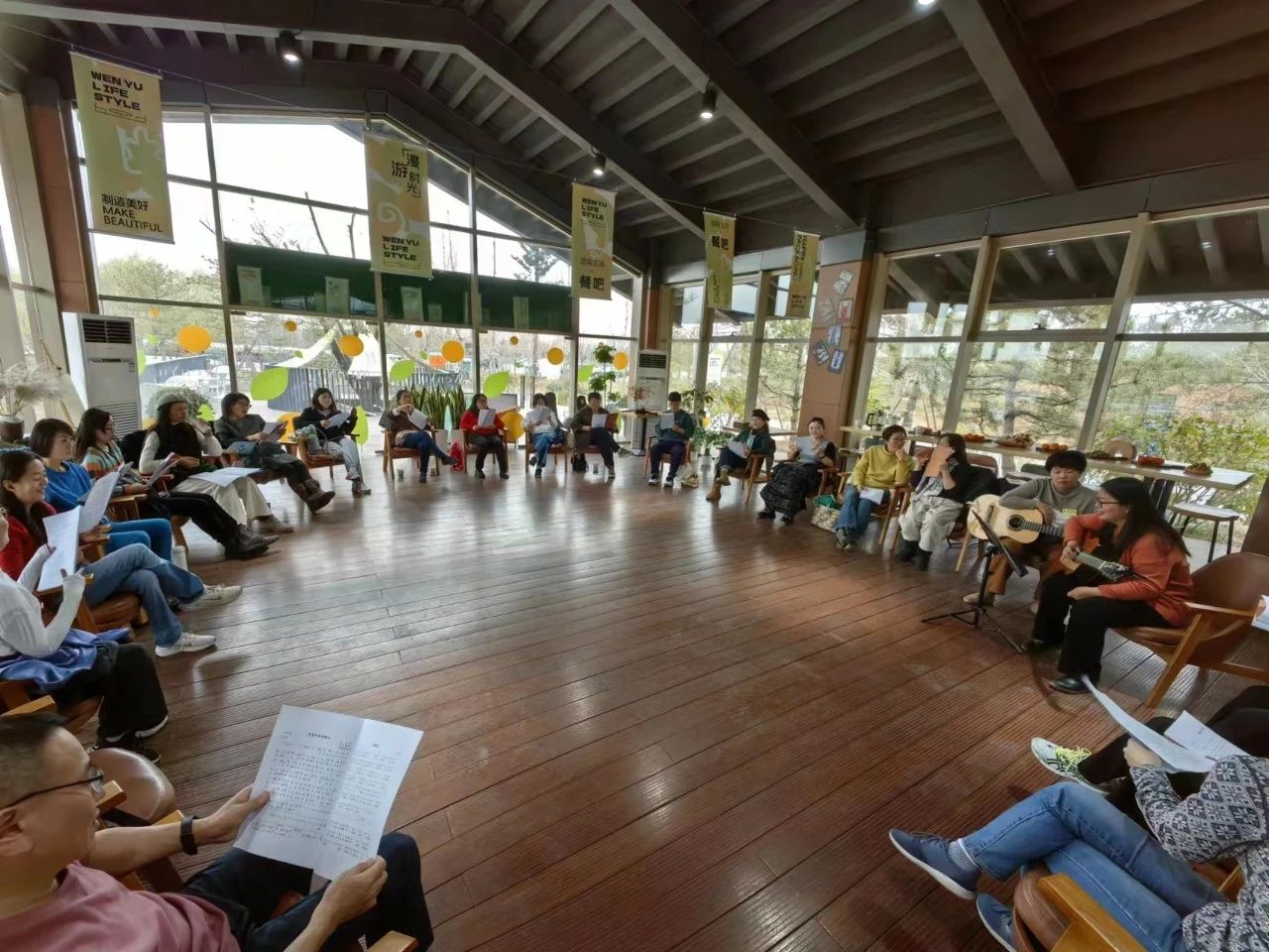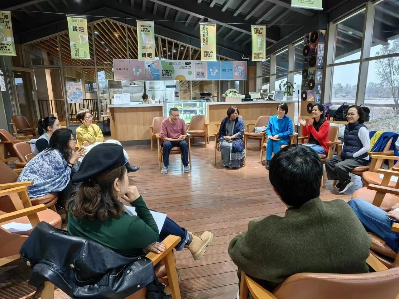 随后老师们到温榆生活馆参加“家庭生活的艺术系列-节气音乐与茶话”沙龙。在郭静老师和际荣老师的带领下,老师们颂唱《廿四古诗词节气“——立冬》、《眼睛》、《童年》等歌曲。大家在节奏中起舞,唱出心中的旋律,在音乐中感受当下的美好和情绪的流动,并将这份韵律和美好更多地带入到生活中。