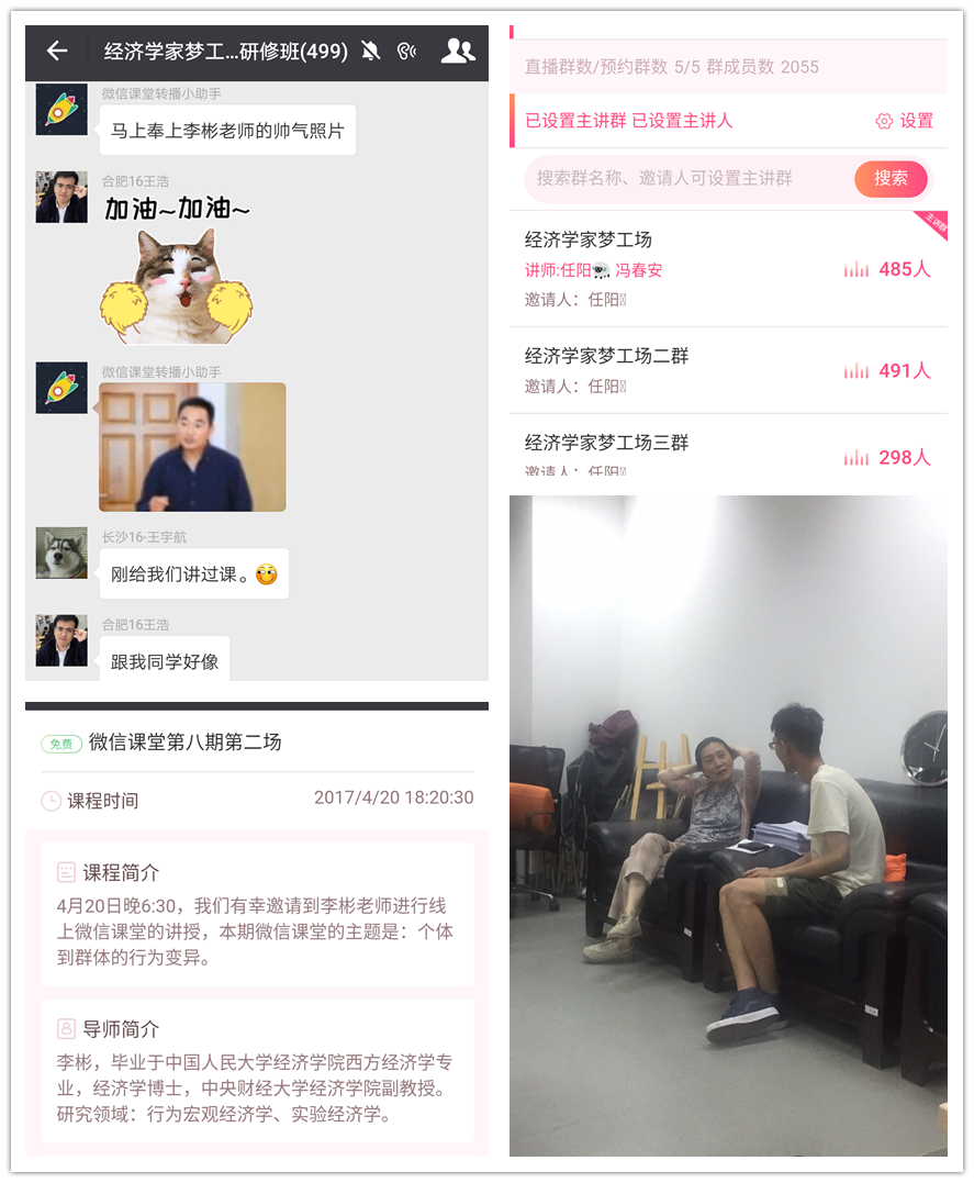 兴趣决定方向,“经济学家梦工场”以微信课堂为依托,邀请学院深受学生喜爱的教师开展微信在线讲座,讲授趣味盎然的专业话题,激发学生兴趣,实现对学生的“云”服务。本学期,微信课堂拓展新形式,联合微信第三方平台开展多群直播,成功实现5个微信群,2000余人同步收听微信课堂,并建立“经济学家梦工场”直播间,提供可留存、反复收听课程的平台。本学期共邀请张勇、李彬、李静、尹振东、冯春安、高伟、吴江、徐学慎、杨铮9位老师在线授课,举办了“供给侧改革与中国转型”、“个体到群体的行为变异”、“经济行为的空间选择”、“政府监管理论简介”、“中国共产党理论自信的政治经济学解读”、“宏观经济基本指标解析”、“基于大数据分析的商业创新与经济决策”、“经济学中的人性”、“宏观经济与微观基础——关于经济学研究范式的思考”9场专题讲座,以现实问题冲击学生思绪,激发学生的专业兴趣。