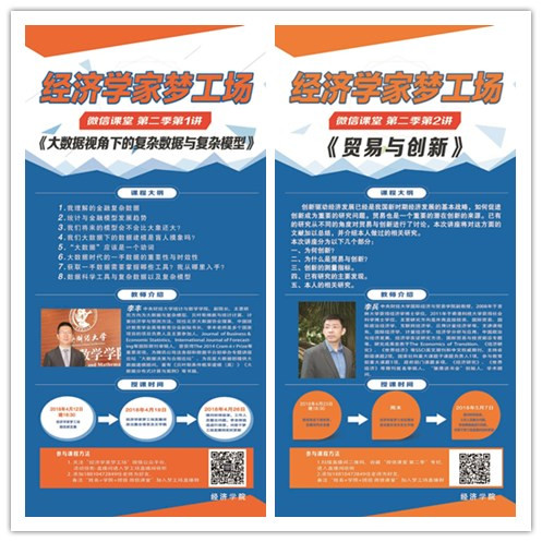 兴趣决定方向,培育拔尖的经济学人才,离不开兴趣的激发和视野的提升。“经济学家梦工场”以微信课堂为依托,邀请学院深受学生喜爱的教师开展在线讲座,讲授趣味盎然的专业话题,激发学生兴趣,实现对学生的“云”服务。第十一期微信课堂,新增了“喜马拉雅FM”经济学家梦工场专辑,将微信课堂内容转录上传至专辑中,形成了微信课堂内容合集,方便经济学家梦工场各微信群成员收听内容,同时仍然保留了微信群答疑功能,进行群成员和授课教师的话题互动。本期微信课堂录制了蒋选老师主讲的两期内容,分别是“经济学学习方法漫谈之一”、“经济学学习方法漫谈之二”。第十期微信课堂,由李丰、李兵、李彬、李静四位老师,带来了主题为“大数据视角下的复杂数据与复杂模型”、“贸易与创新”、“个体到群体的行为变异”、“经济行为的空间选择”的四场微信课堂。