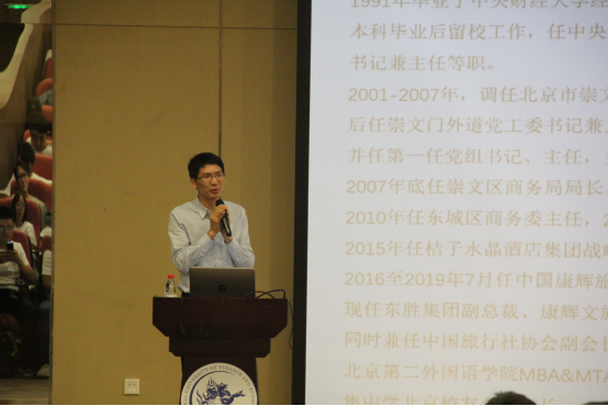 在同学们满心的期待和热烈的掌声中,首先由陈斌开院长隆重介绍孟志军校友。孟志军校友现任东胜集团副总裁、康辉文旅产业集团联席董事长,同时兼任中国旅行社协会副会长,中国步行商业街工作委员会及中国商旅文化产业联盟专家委员,中国商业学会理事等。