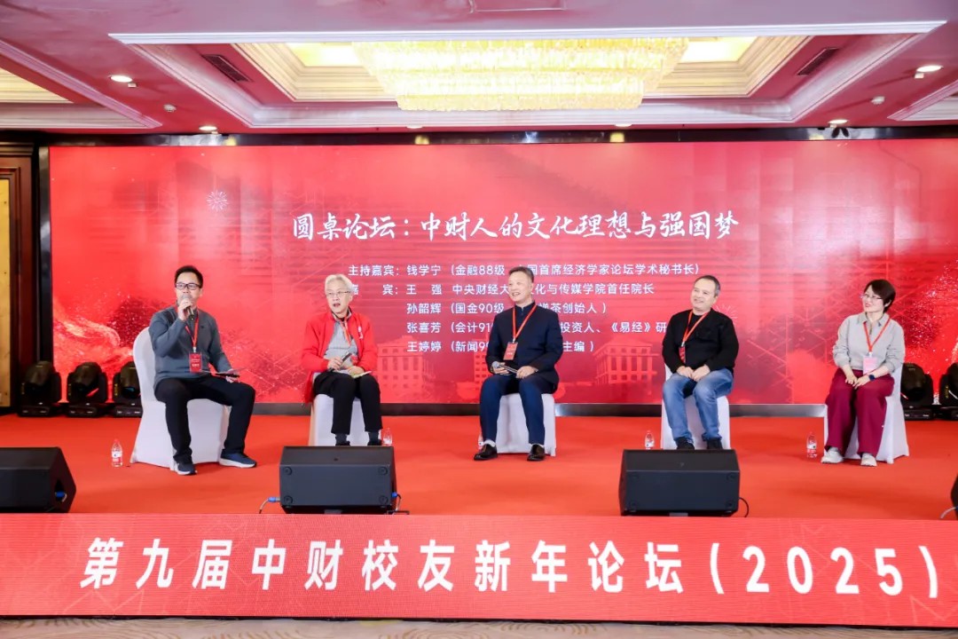 第二场圆桌论坛以“中财人的文化理想与强国梦”为主题,由金融1988级校友、中国首席经济学家论坛学术秘书长钱学宁主持,我校文化与传媒学院首任院长王强,国金1990级校友、自在禅茶创始人孙韶辉,会计1991级校友、知名金融投资人、《易经》研学者张喜芳,新闻1999级校友、新浪财经主编王婷婷作为嘉宾,分享中国人的文化自信与国运大势之间的密切关联,共同探讨现代文明与传统文化、中西方文化之间的异同、协调与共存,对传统文化的回潮、数字化浪潮下文化产业的创新变革进行深入解读,纵横捭阖,干货满满。