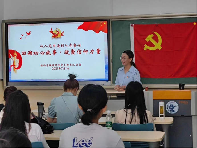 宣誓仪式后,任晶老师主持召开了以“从入党申请到入党誓词|回溯初心故事·凝聚信仰力量”为主题的党史学习教育专题党课。任老师首先通过展示老一辈革命先烈的入党申请书原件,带领同学们重温共产党人的初心使命与对党的深情,随后她梳理了入党誓词的历史源起和严革变迁,回顾了不同历史时期、不同的革命形势下入党誓词的内涵。入党誓词的沿革反映了我们党从不放松党的建设、高度重视对党员进行党性教育和理想信念教育,反映了我们党善于把握不同历史时期的主题和要求来发展党员、具有与时俱进的先进性。最后,任老师对新发展入党的党员们提出了要求:“希望同学将来不论担任何种职务、从事何种工作,都要明白自己是一名在党旗下宣过誓的共产党员,用入党誓词约束自己,把入党誓词各项内容落实到行动上、落实到各项事业中,切实做到为党分忧、为国尽责、为民奉献。”