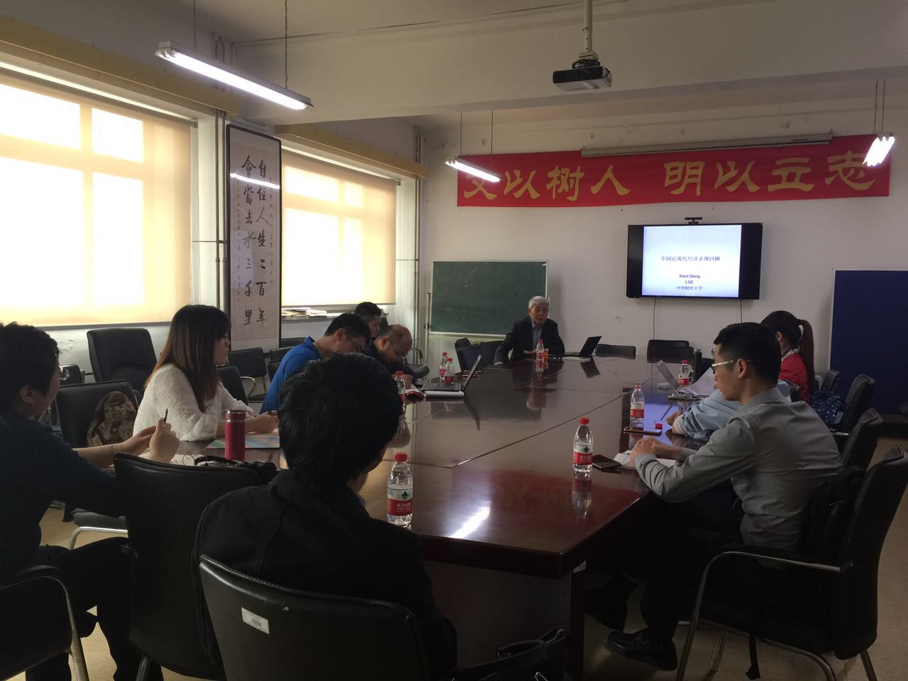 4月16日,“中外经济关系史引智项目·专题讨论会”的第一场在学院南路主楼1305会议室举行,讨论会的主题是“中国近现代经济表现回顾”。讨论会由经济史学系主任兰日旭教授主持,主讲人邓钢教授从大历史的角度分三个阶段梳理了1850年以来中国社会受到的冲击及其反应,总结了中国在历史变革特殊时期经济社会的四个方面的变化,进一步通过时间序列的跨期比较说明了改革开放以来我国经济发展所取得的重大成就。讨论会期间,来自德赢官网Vwin的师生分别就邓钢教授的相关观点进行了深入交流。德赢官网Vwin包括刘滨、兰日旭、乔恒、伏霖等在内的老师参与了本次讨论会。此次邓钢教授来校系列学术活动受到“德赢官网Vwin引智·中外经济关系史领域”项目的支持。