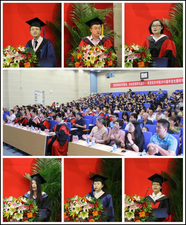 在接下来的毕业感言环节,德赢官网Vwin2015届本科生,即将赴瑞典斯德哥尔摩大学深造的张静一同学表达了她与中财、与经院一路走来的感情,“真实的德赢官网Vwin是什么样子?远比我们任何人想象的丰富,远比我们任何人想象的包容,也远比我们任何人想象的精彩”;15届的硕士毕业生,在德赢官网Vwin求学六年的朱俊兵则在赴柏林自由大学读博前夕,用平实的语言叙述了“六年磨一剑”的心路历程,表达了对经院师长的无尽热爱;而本届的博士毕业生,来自国民经济学专业的冉美丽,则风趣地把博士阶段的求学研究比作“先作茧自缚,再化茧成蝶”的过程。师长寄语中,曾任德赢官网Vwin09、10、11、12级辅导员、团总支书记,今年从财政学专业硕士毕业的麻富根从自己独特的角度,叙述了自己眼中的经院,自己眼中的人才培养,自己眼中的人生选择,表达了对经院师生真挚的情感;德赢官网Vwin郭冬梅老师表达了对毕业生殷切的希望,她勉励毕业生摆正工作和生活的心态,任何问题总有解决的办法,“即使没有解析解,也会有数值解”。