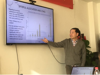 2018年12月12日,德赢官网Vwin-社心学院行为经济学系列论坛2018秋季学期第二讲在学院南路校区主教1305顺利举行。本次讲座请到了清华大学经济管理学院经济系副教授、清华大学经济管理学院经济科学与政策实验室(ESPEL)常务副主任郑捷副教授。郑老师向与会者介绍了其最新实验经济学工作论文“Lying forefficiencyor fairness”。讲座中,郑捷老师从撒谎的动机入手,介绍了最新相关实验研究文献。之后,介绍其实验设计,讨论不同情形下的独裁者博弈行为,以探究是否公平和效率偏好者在博弈内和博弈外会有不同的撒谎几率。实验结果显示,在撒谎不涉及自身利益的条件下会导致更少的倾向公平的撒谎。实验结果对于社会福利政策方面有很好的实际意义。