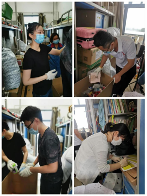 来到宿舍楼,老师们分为27个工作组进入学生宿舍,按照培训的步骤,迅速地熟悉了环境,正式“开工”。让我们一起看看,在打包现场的那些熟悉的面孔。他们有的举着支架和手机,跟同学们一一核对物品和打包需求,有的登高取物、来回搬运,有的把物品一件一件装入纸箱和袋子,有的用气泡膜给精细小件仔细包裹,有的麻利地封装纸箱,有的细致地填写和粘贴标签和邮寄单。老师和学生一起线上共同经历这个特别而难忘的时刻,氛围很是热烈,老师们投入的样子,可爱可敬。