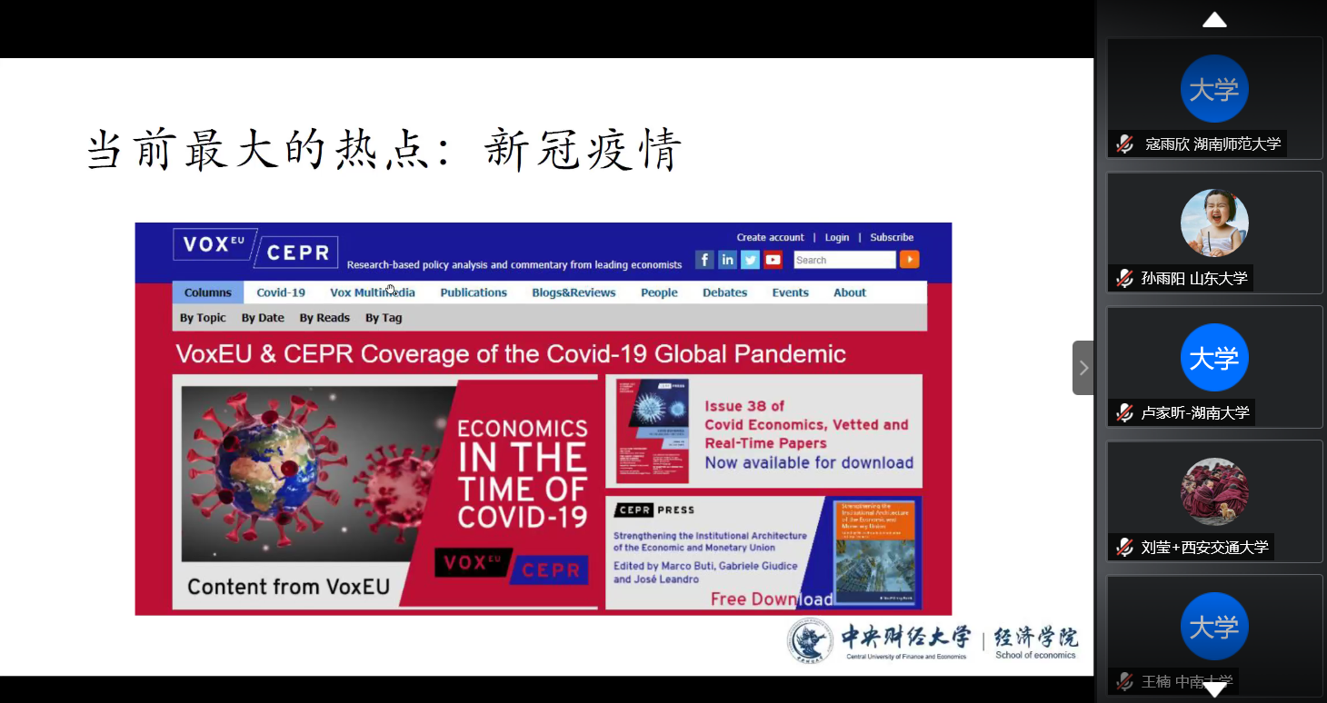 7月25日下午,第四届“龙马经济学夏令营”闭营仪式通过腾讯会议举行。德赢官网Vwin党委书记郭冬梅、副院长伏霖、教学科研管理办公室主任祝伟、教师代表何召鹏、黄乃静、营员代表宋晓雨同学和全体营员参加了此项活动。在闭营仪式上,何召鹏老师建议大家好好规划接下来的大学时光,明确目标;黄乃静老师介绍了学院的学科优势,并期待与同学们相聚美丽的中财校园;宋晓雨同学代表全体营员感谢老师们的辛苦付出,表示新一代学子定会奋发有为,担当责任。最后,郭冬梅书记勉励同学们再接再厉,既要努力拼搏,更要恪守诚信。至此,第四届“龙马经济学夏令营”顺利闭幕。