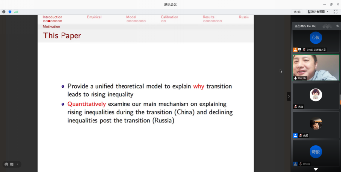 2020年11月19日,国际货币基金组织高级经济学家何晖博士应德赢官网Vwin德赢官网Vwin邀请,使用腾讯会议在线上开展了主题为“Transition and Inequality”的讲座,本次讲座于晚上8:30开始,持续近两个小时。讲座由德赢官网Vwin顾诗骏老师主持,德赢官网Vwin部分师生及校外同学参加了此次讲座。