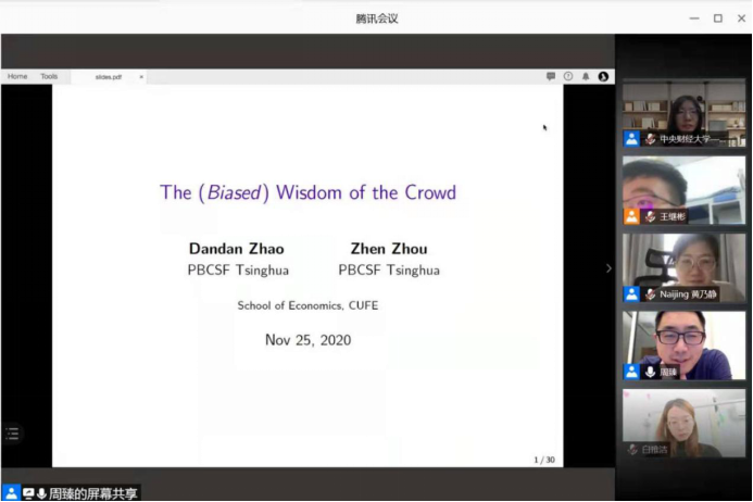 2020年11月25日,清华大学五道口金融学院周臻老师应德赢官网Vwin德赢官网Vwin邀请,使用腾讯会议在线开展了主题为“The (Biased) Wisdom from the Crowd”的讲座,本次讲座于下午13点30分开始,持续两个小时。讲座由德赢官网Vwin黄乃静老师主持,尹振东老师、龚雅娴老师、吴楠老师、刘航老师及校内外同学参加了此次讲座。