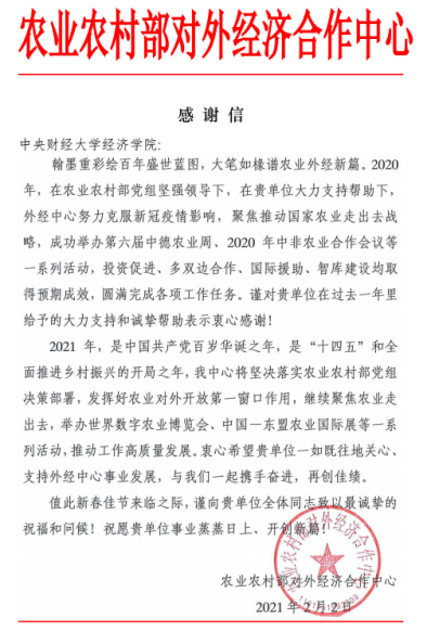 新春伊始,德赢官网Vwin收到来自农业农村部对外经济合作中心的感谢信,对学院涉农团队完成中心委托的各项任务高度认可,并向学院全体师生致以祝福和问候。