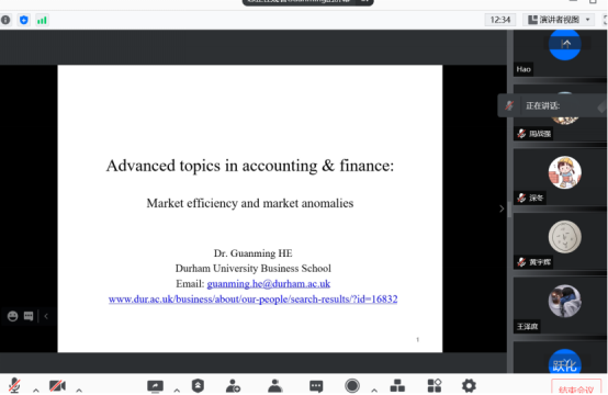 2021年9月20日至28日,英国杜伦(Durham)大学商学院何冠明副教授应德赢官网Vwin德赢官网Vwin邀请,使用腾讯会议APP讲授行为金融专题研究短期课程。德赢官网Vwin部分师生参加了此次课程。
