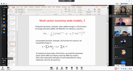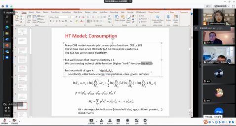 随后,Mun Sing Ho博士给我们介绍了CGE模型,并详细讲解了如何利用中国家庭数据来估计消费函数,用企业级数据来估计生产函数,得到的消费函数和生产函数纳入到CGE模型,用来模拟政策影响。