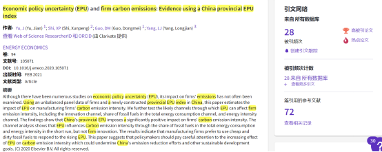 近日,德赢官网俞剑副教授与郭冬梅教授、财政税务学院杨龙见副教授、悉尼科技大学施训鹏研究员合作发表在国际能源经济学领域知名期刊《Energy Economics》(2021年第2期)的文章Economic policy uncertainty (EPU) and firm carbon emissions: Evidence using a China provincial EPU index于2021年11月成功入选ESI前0.1%热点论文和前1%高被引论文,这是我校2021年唯一入选ESI前0.1%热点论文。该文使用高频词人工筛选和人工阅读相结合的方式筛选出经济政策、不确定性的基础词条,首次构建了中国省级层面的经济政策不确定性指数,并考察经济政策不确定性对中国企业碳排放行为的影响。
