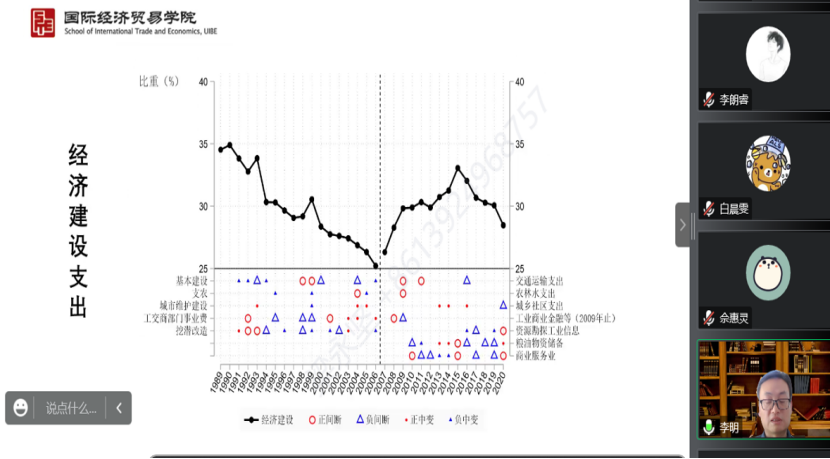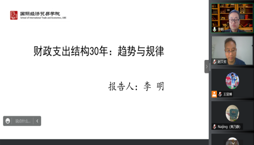 2022年11月15日14:00,对外经济贸易大学财政税务学系教授、博士生导师,政府管理学院副院长李明应德赢官网Vwin邀请,开展主题为“财政支出结构30年:趋势与规律”的讲座。本次讲座在线上举行,李明教授受到了老师和同学们的热烈欢迎!德赢官网Vwin赵文哲教授主持讲座,尹振东教授、黄乃静副教授、杨晓兰副教授参加了讲座。