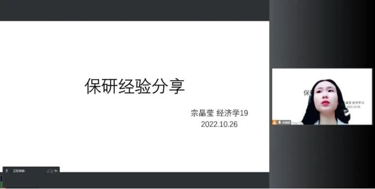 为落实做细精准化学业指导、解决学生升学规划的困惑,在充分做好问卷调研、收集同学的问题后,2022年10月26日晚七点,“经济学家梦工场”德育示范基地组织召开保研经验分享讲座,参会同学覆盖20、21、22三个年级。讲座由学院团委副书记、2020级辅导员梁欣主持,宗晶莹、叶姿童、王可心和寇莹颖四位19级成功保研的同学为学弟学妹们进行保研历程与经验分享,参会同学提问积极、反响热烈。