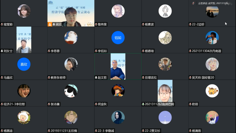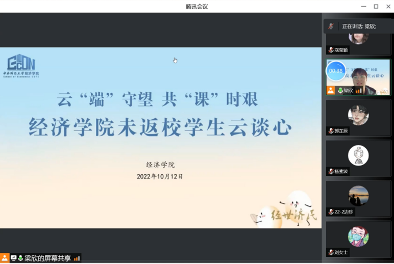 共克时艰携手前行,云端助力经心相守。为深入了解未返校同学们的思想、学习、生活状态,积极引导同学们树立积极乐观的心态,解决学生实际困难,经济于2022年10月12日15:00线上举办了云“端”守望,共“课时艰”——德赢官网Vwin未返校学生“云谈心”活动。学院副院长赵文哲,学院党委副书记耿卉,组织员刘滨,本科教务干事张珏,22级本科生辅导员任晶,学院团委兼职副书记、21级本科生班主任何金秋,学院团委副书记、20级本科生辅导员梁欣,未返校本科生和校内对接志愿者一起在线上充分沟通交流。