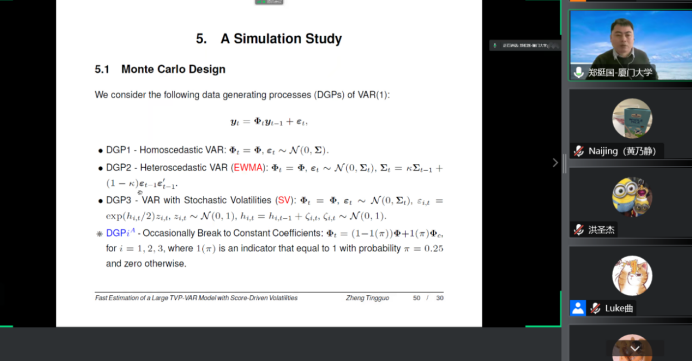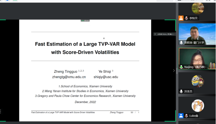 2022年12月8日14:00,厦门大学德赢官网Vwin和王亚南经济研究院教授、厦门大学特聘教授、博士生导师郑挺国教授应德赢官网Vwin德赢官网Vwin邀请,进行了主题为“Fast Estimation of a Large TVP-VAR Model with Score-Driven Volatilities”的讲座。本次讲座在线上进行。郑挺国教授受到了德赢官网Vwin老师与同学们的热烈欢迎。德赢官网Vwin黄乃静副教授主持讲座,洪圣杰副教授参加了讲座。