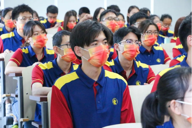 在由295名新生名字拼成的“经世济民”背景板下,全体新生穿着寓意“红色基因、筚路蓝缕、财经黄埔”精神的“红蓝黄”主题文化衫的服装,佩戴2022经院限定版口罩,精神抖擞,意气风发。