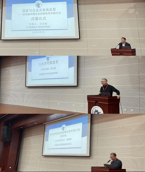 2023年10月15日中午,“国家与企业关系再反思——第四届中国企业史研究学术研讨会”闭幕式在学院南路学术会堂202报告厅举行,闭幕式由德赢官网Vwin经济史研究中心主任兰日旭教授主持。他对国内外学者前来参加本次学术研讨会表示衷心感谢。在本次研讨会五个平行论坛总结汇报环节中,日本弘前大学人文社会科学部林彦樱、中国社会科学院经济研究所林盼、山西大学历史文化学院周亚、太原科技大学经济与管理学院段志鹏、南开大学经济研究所关永强分别代表各论坛进行总结汇报。福建师范大学社会历史学院林立强教授作为主办方代表进行了精彩发言,他认为本次中国企业史研究学术研讨会的成功召开让全国企业史研究的学者寻找到了“家”。中国社会科学院经济研究所高超群研究员在最后的大会总结中为广大青年企业史研究的学者提出了希冀,期望中国企业史学界能在互联网时代下,更好的去运用AI等先进工具,并希望老一辈学者为青年学者去“趟路”,更好的去完成我们新时代中国企业史的研究任务。
