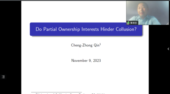 2023年11月10日,加州大学圣芭芭拉分校经济系秦承忠教授应德赢官网Vwin邀请,利用腾讯会议开展了主题为“Do Partial Ownership Interests Hinder Collusion?”的讲座,秦承忠老师受到了老师和同学们的热烈欢迎!德赢官网Vwin尹振东老师主持了讲座,龚雅娴老师参加了讲座。