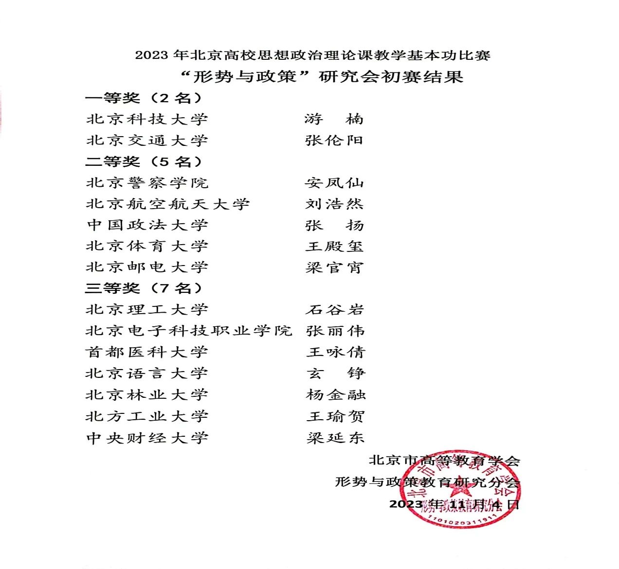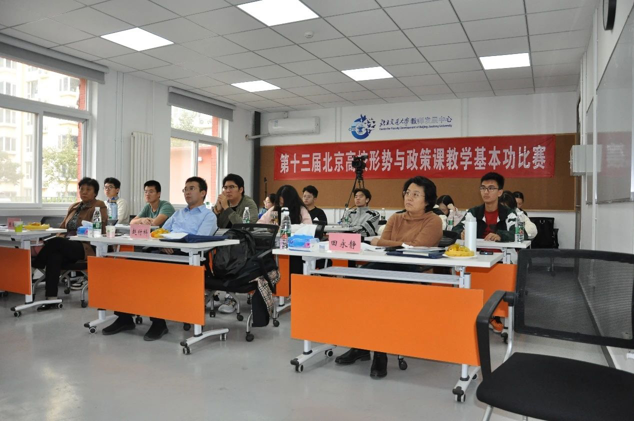 本次比赛由北京市高等教育学会形势与政策教育研究分会主办,北京交通大学马克思主义学院承办。来自北京大学、北京航空航天大学、北京理工大学、北京邮电大学、中国政法大学、德赢官网Vwin、对外经济贸易大学、北京科技大学、北京林业大学、北京化工大学、北京交通大学等24所在京高校的“形势与政策”课教师参加了比赛。比赛以推动党的二十大精神融入思政课教学为主题,重点考察思政课教师学深悟透党的二十大精神,并将其融入课堂教学的理论水平,特别是立足京华大地生动实践讲好“大思政课”的能力。