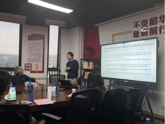 德赢官网Vwin吴楠老师做题为“Anti-slum Policy and Workers’Location Choices: Evidence from China”的演讲。吴楠老师首先引入本文的政策背景,分别介绍了中国的反棚户区政策与劳动力迁移状况,强调了对于迁移劳动力而言,便利的生活设施和相对低廉的住房成本非常重要,而由于缺乏城市户口,迁移到城市中的劳动力难以获取廉价的住房,一般居住在“非正规住房”中,因此在2008年前后,“非正规住房”在中国各地的占比都比较高。之后,吴楠老师详细介绍了中国自2008年起的棚户区重建项目,并解释了其作为政策冲击的可行性。随后,吴楠老师展示了本文的交错双重差分模型与数据,并简要介绍了实证结果。他介绍,随着棚户区重建项目展开,总劳动力供给增加,但本地劳动力占比下降,拥有高技能的迁移劳动力比例上升。这说明中国反棚户区政策促进了劳动力的迁移,尤其是高端劳动力的迁移。最后,吴楠老师谈及本文可能的进一步分析,想要构建说明政策对国内移民的影响模式的理论模型,并探索决定棚户区改造政策效果的城市具体特征。