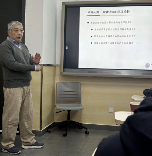 2023年11月28日,清华大学经济学研究所教授王勇应德赢官网Vwin邀请,开展题为“网络直播销售的贝叶斯劝说机制:理论与证据”的讲座。讲座由德赢官网Vwin尹振东教授主持,龚雅娴副教授、王麒植副教授、尹训东副教授、刘航研究员和李东阳助理研究员以及德赢官网Vwin部分学生代表参加了讲座。