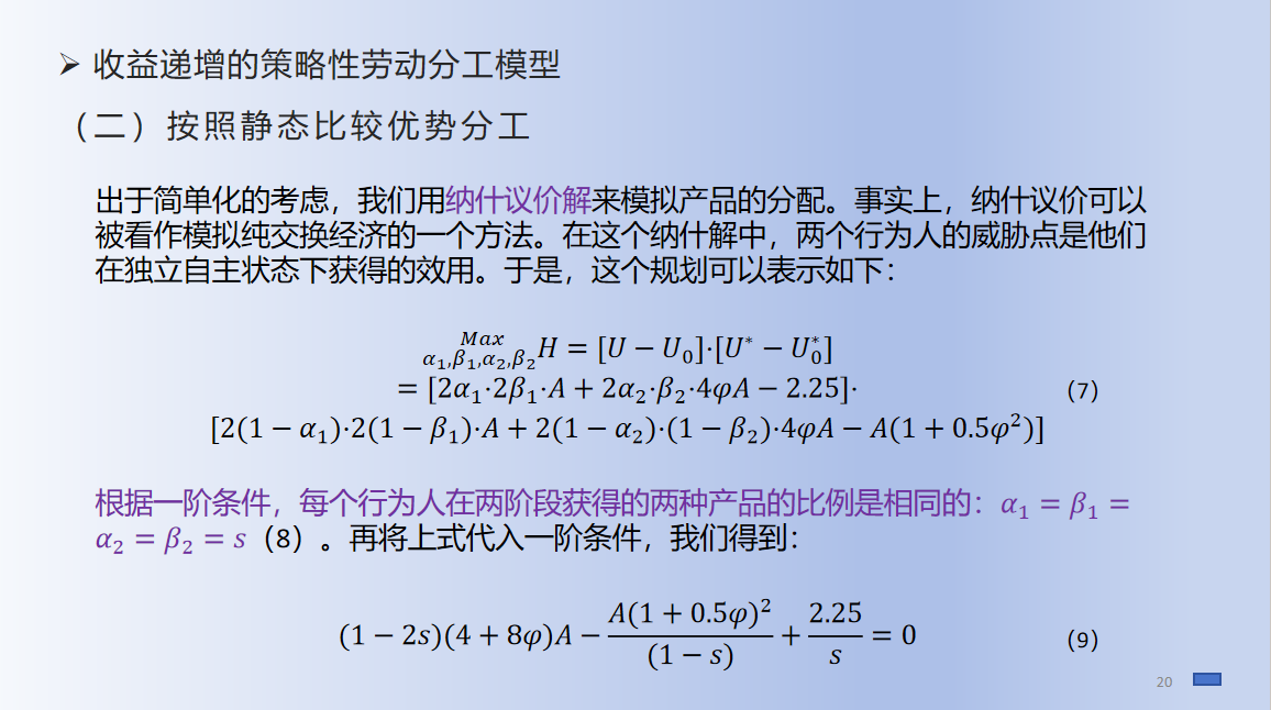 接下来,李研同学分享了《平等与增长携手并进:收益递增、策略性行为和分工的效率损失》一文。文章构建了一个策略性劳动分工模型,从议价效应和比较优势逆转效应的角度,剖析了人们有时选择不分工并因此遭受社会产出损失的原因。该模型表明,在策略性劳动分工决策中,如果未来一期由交易关系瓦解而造成的损失足够小,那么交易成本的降低也可能导致当期分工情况的恶化。进一步的,通过转移支付实现社会产出的更平等分配,可以激励低技能劳动者依据当前的比较优势进行专业化分工,从而促进经济增长。这一模型有助于我们理解国际贸易、国内区域间分工以及家庭内分工中普遍存在的低效率现象,并为相关政策的制定提供了理论依据。