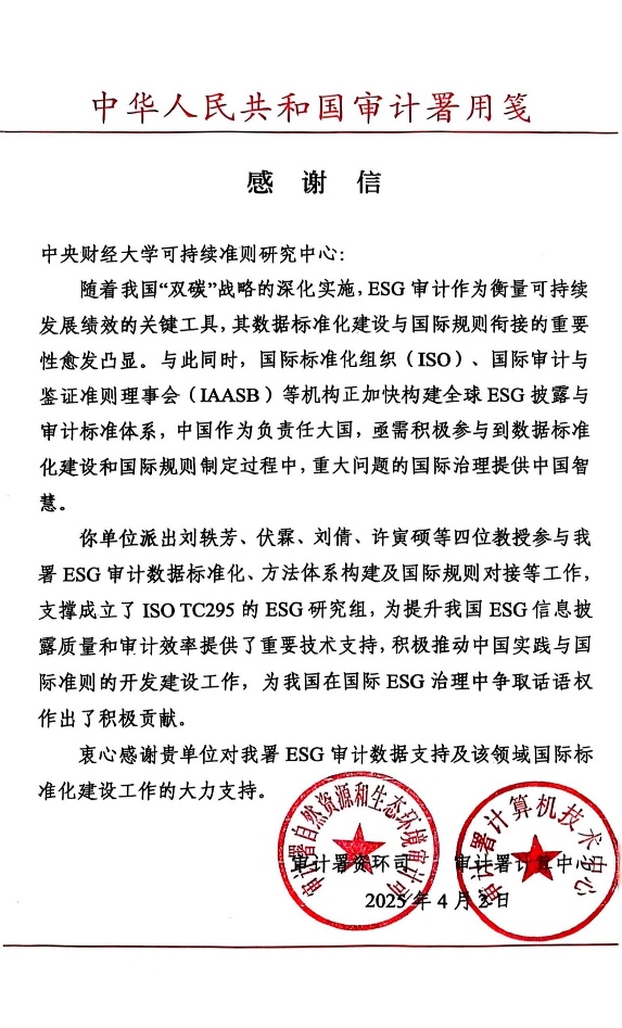 近日,德赢官网可持续准则研究中心刘轶芳、伏霖、刘倩、许寅硕教授收到了来自中华人民共和国审计署的感谢信,对中心在ESG审计数据标准化及国际规则对接领域的重要贡献给予高度评价,并致以诚挚谢意。