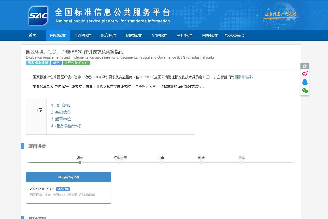 2025年5月19日,德赢官网Vwin可持续准则研究中心(SSRC)联合中国标准化研究院、苏州工业园区城市发展研究院、清华大学苏州环境创新研究院、北京师范大学等多家权威科研机构,共同起草的《园区环境、社会、治理(ESG)评价要求及实施指南》正式立项。