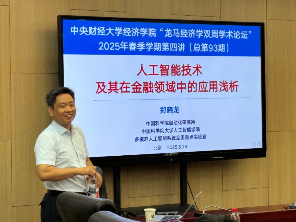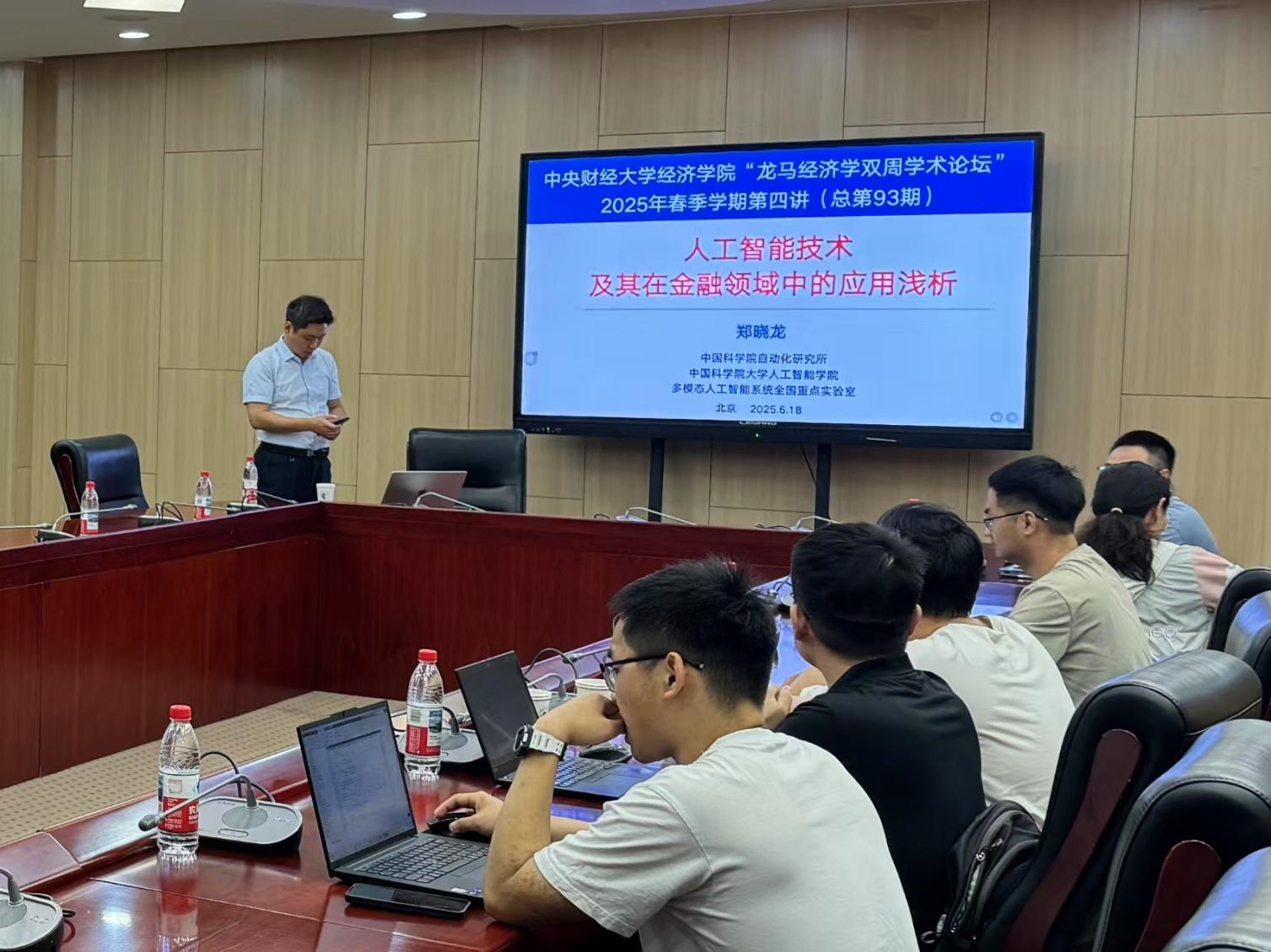 6月18日周三上午,德赢官网Vwin2025年“龙马经济学双周学术论坛”在学院南路校区学术会堂604会议室举行。此次讲座邀请到中国科学院大学人工智能学院的郑晓龙教授,分享题为“人工智能技术及其在金融领域中的应用浅析”的研究。德赢官网Vwin德赢官网Vwin院长郭冬梅教授主持讲座,德赢官网Vwin赵扶扬、吴楠、徐竹烽、胡志安等多位老师和三十余名学生参加了此次讲座。