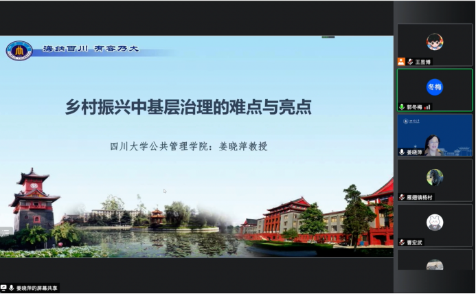 2022年7月21日,四川大学城市治理研究院院长姜晓萍教授受德赢官网Vwin党委邀请,以“乡村振兴中基层治理的难点与亮点”为题开展讲座,拉开本次“乡村振兴”系列讲座的序幕。会议由党委书记郭冬梅主持。德赢官网Vwin中层领导班子及师生、雁翅镇李栋镇长,各村“两委”班子成员,镇机关“马克思主义青年小组”党员干部共同在线参与学习。
