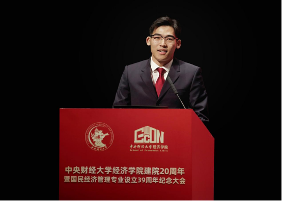 在校学生代表阎子豪发言。阎子豪代表全体经院学子,向德赢官网Vwin表达最衷心的祝福。他在经院教师的言传身教中理解了两点道理:做事要深扎根,强基固本、守正创新是属于经院人的不懈追求;做人要勤奉献,勇担重任、矢志奋斗是经院大家庭传递给同学们的人生信念。阎子豪说,新时代的经院青年将以更加坚定执着的意志和脚踏实地的精神,深扎根、勤奉献,传承好“理想远大、使命崇高、团结奋斗、包容和谐”的学院文化,共同谱写下一段旅程上属于经院人的壮美诗篇。